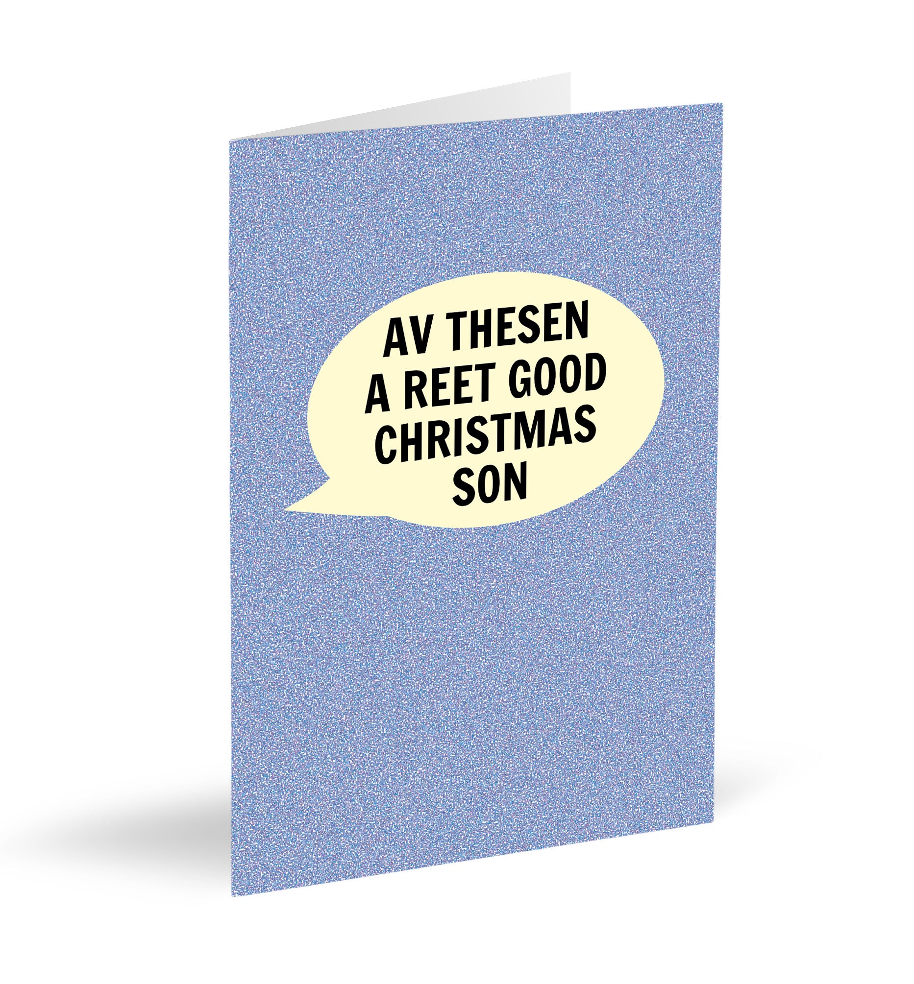 A fun Christmas card in a glittery Cornflower Blue with our signature speech bubble which reads 'Av A Reet Good Christmas Son'.